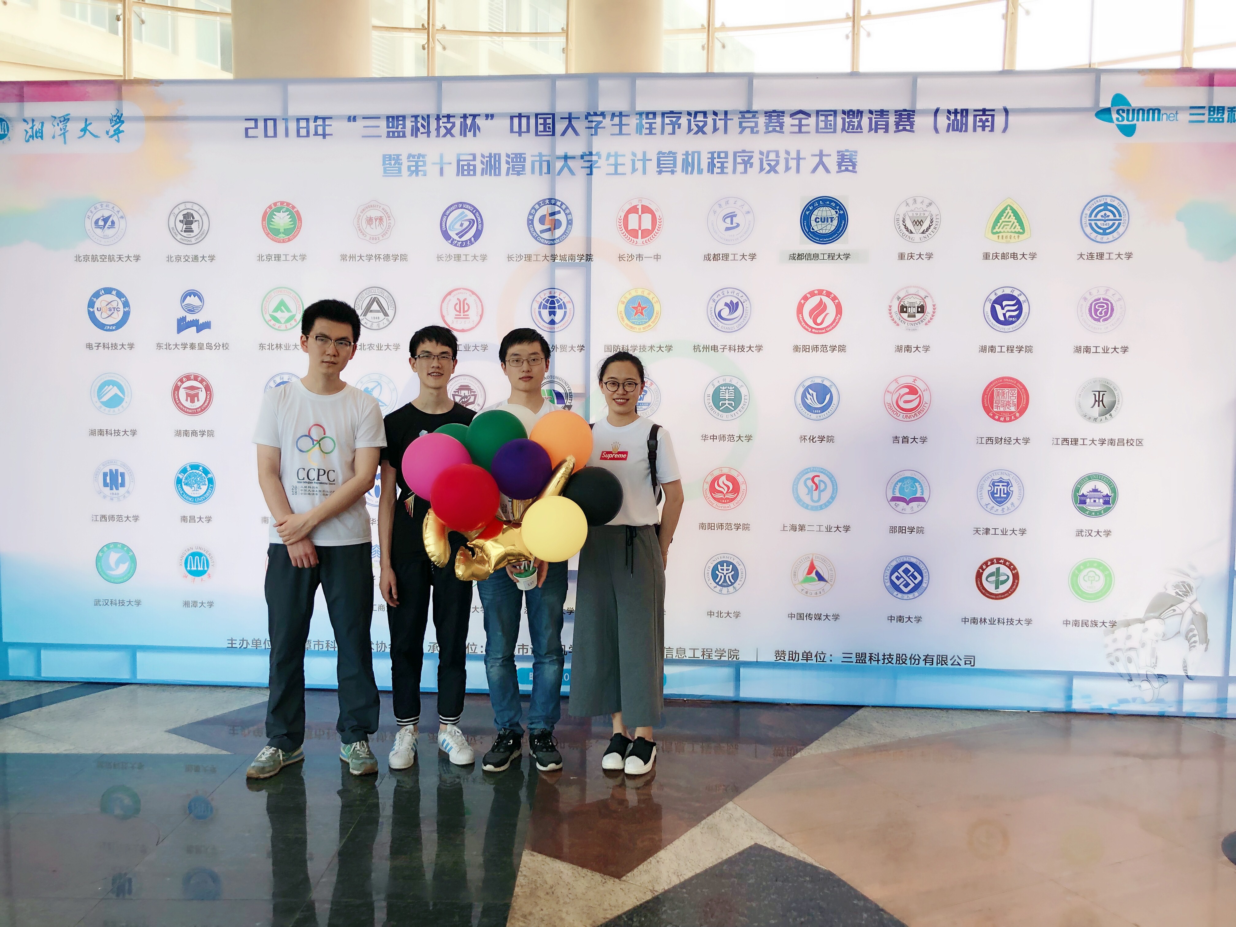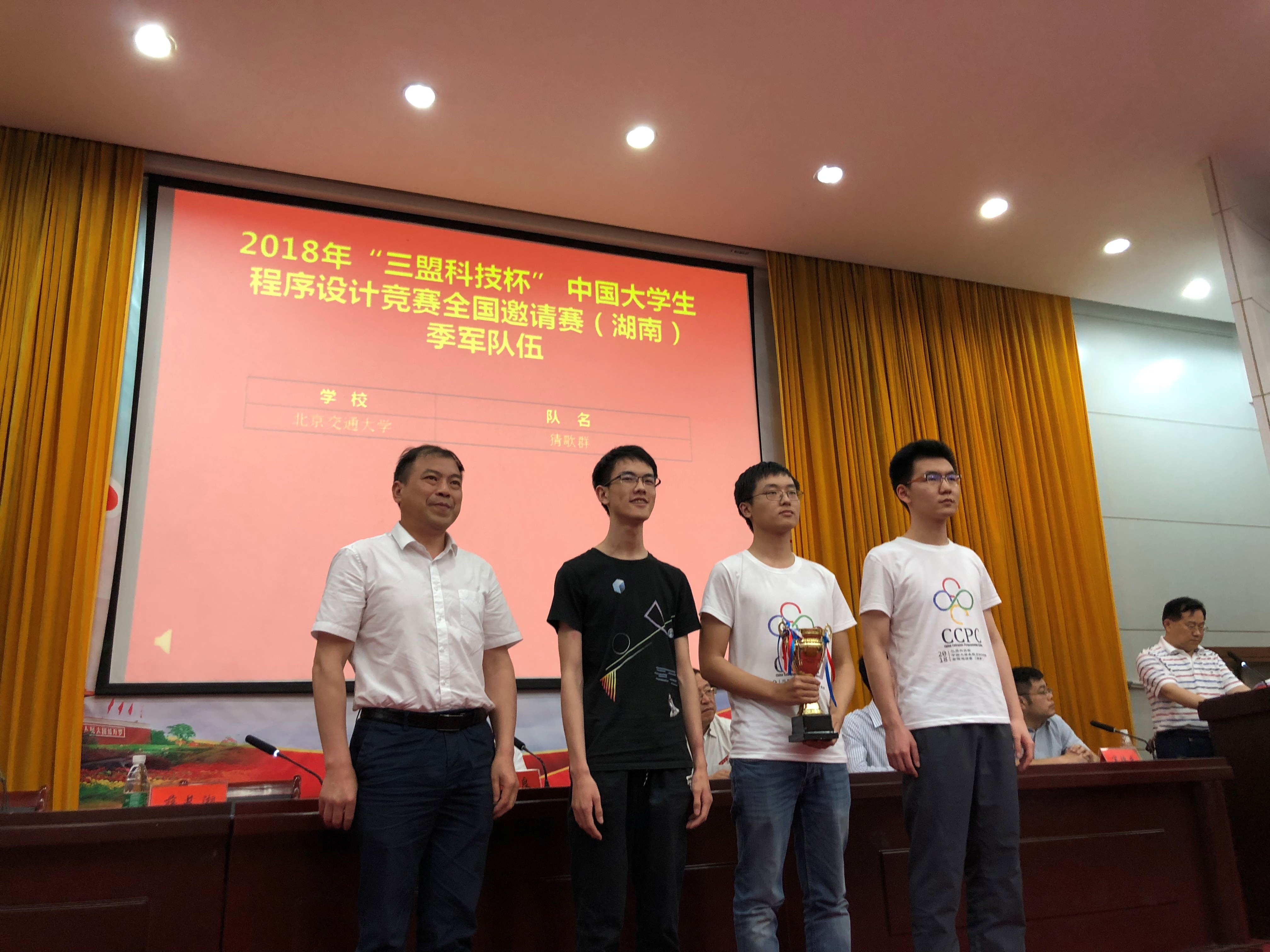 2018年第4届CCPC(中国大学生程序设计竞赛)全国邀请赛湘潭赛站于2018年5月12日-13日在湘潭大学举行。我校派出参赛队伍——“猜歌群”队(何卫锋、郑黎明、王天舒)赴现场参赛。来自全国60所高校的177支队伍展开激烈角逐。在本赛站的开幕式上,我校ACM教练许华婷应邀代表参赛教练发言。湘潭市科学技术协会党组书记、主席涂敬阳,湘潭市人民政府秘书长刘定良,湘潭市科学技术协会副主席蒋长湘,湘潭市计算机学会理事长刘任任,湘潭大学副校长刘建平,湘潭大学科协秘书长许斌等出席闭幕式。